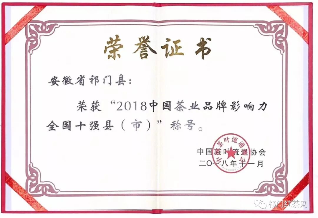 11月15日,第十四届中国茶业经济年会开幕式暨2018中国茶业品牌盛典在武夷山盛大举行。祁门县荣获“2018中国茶业品牌影响力全国十强县(市)”、“2018中国茶业百强县”称号。
